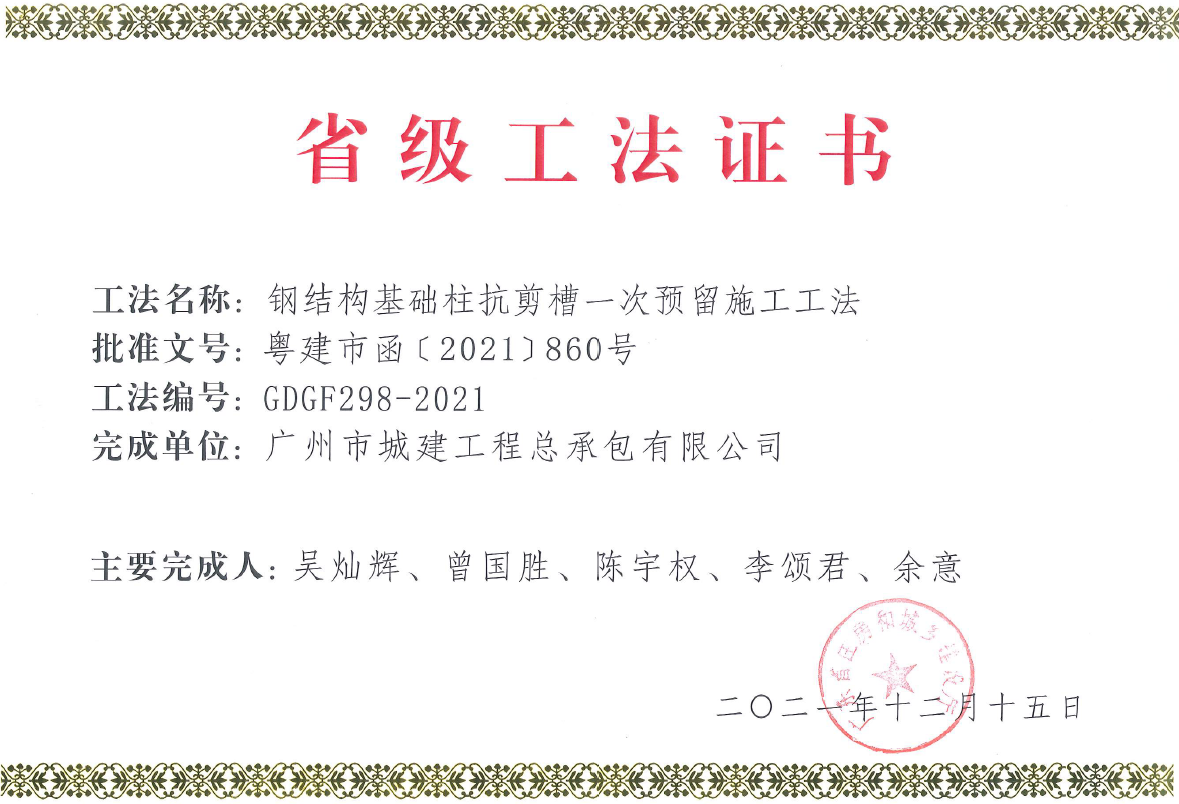 鋼結構基礎柱抗剪槽一次預留施工工法證書